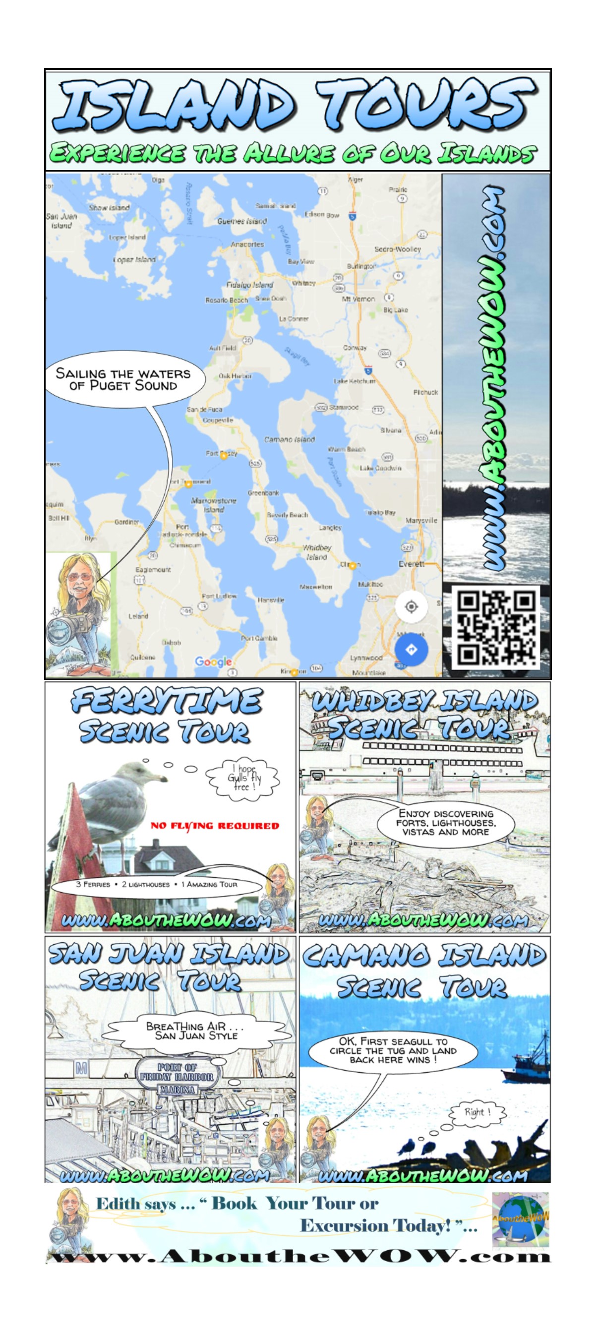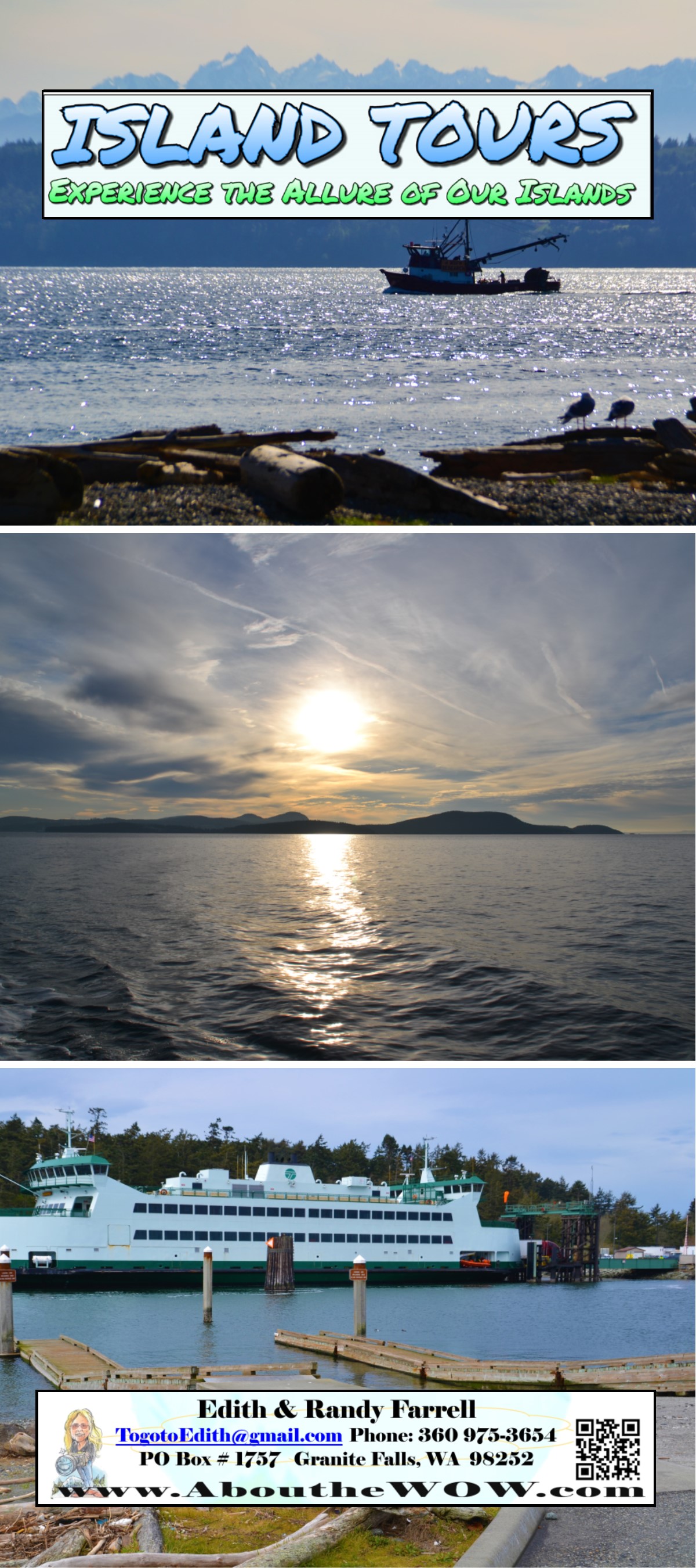 Some of our Island Tours are not requiring Ferry Service and both the Whidbey Island Tour and the Camano Island Tour schedules are accessable via land. We are in a very climate sensitive region and at times our vistas and vantage points are more spectacular. Please relax and enjoy the beauty of our tours while allowing the sun to shine even in the rain !